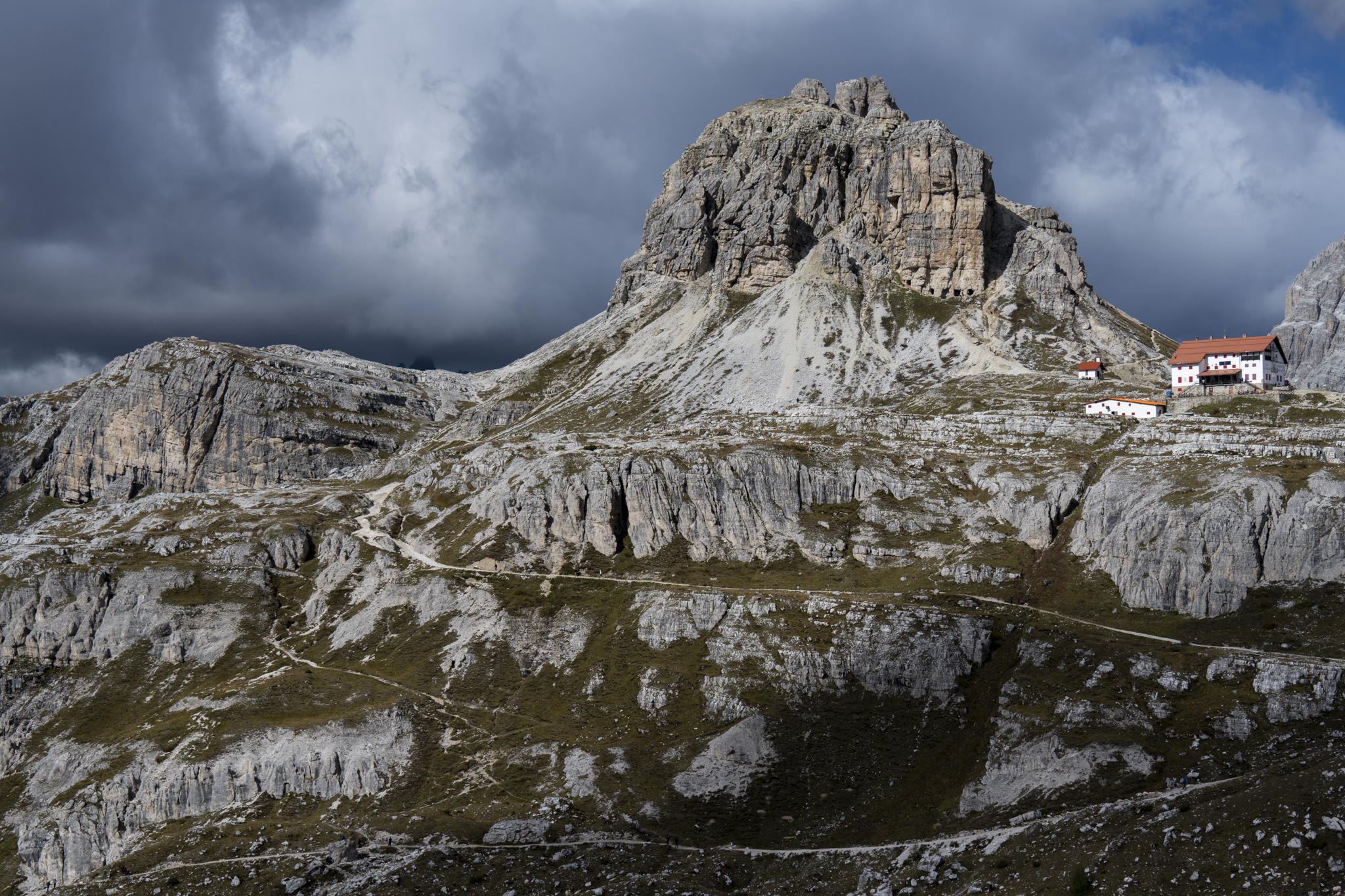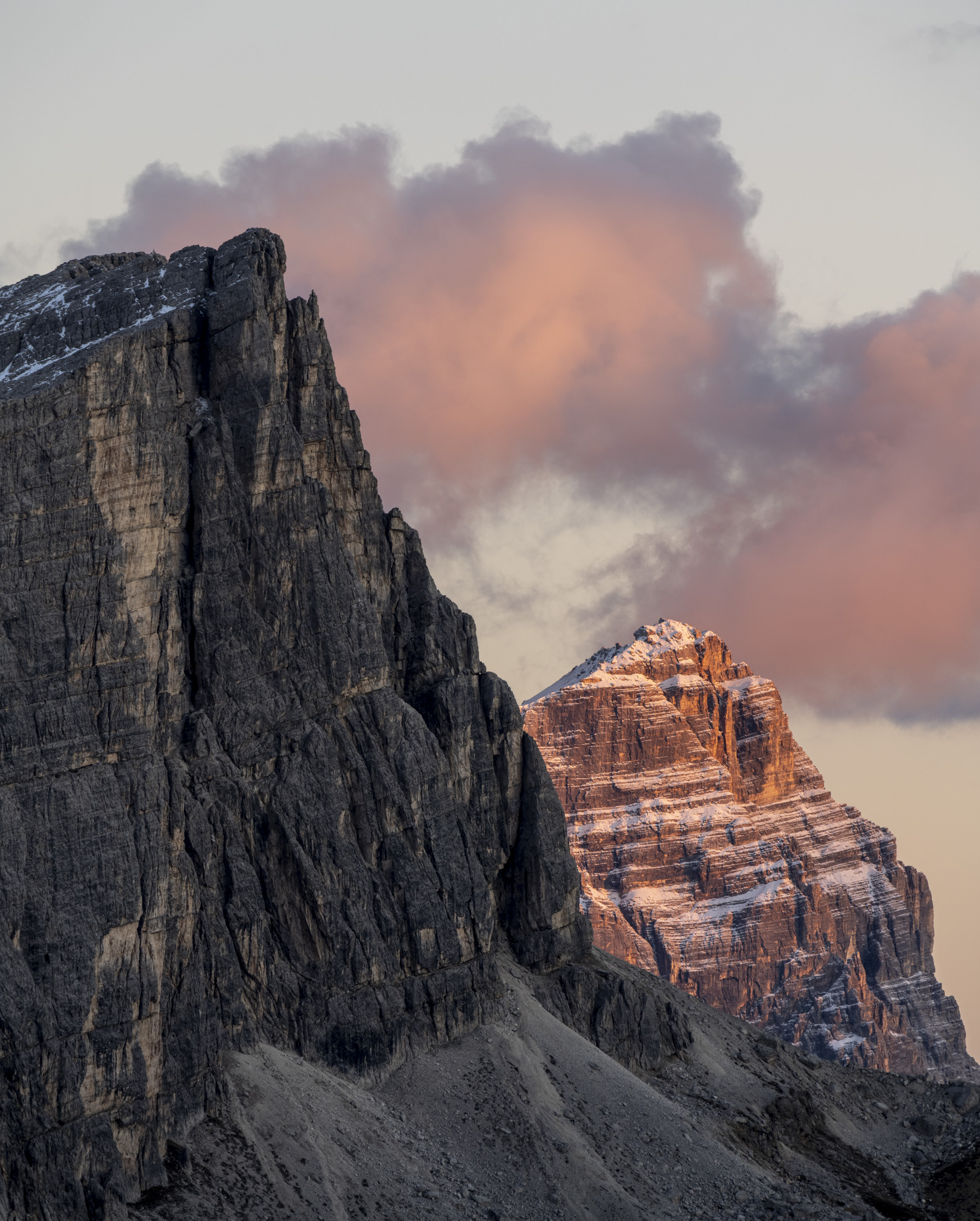 There’s a bit of walking here but our efforts are rewarded with wonderful views of the striking jagged pillars of the north face of Tre Cime di Lavaredo reaching towards the sky, as the sun paints them in shades of gold and red.